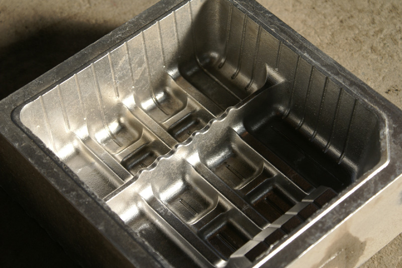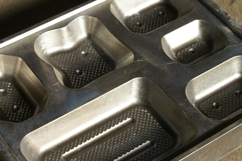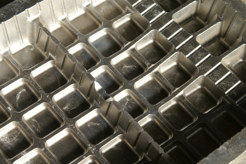 しかし、当社の鋳物技術ブライトキャスト技術で作った真空成型金型を使って成型された食品トレイは、保管の時に重ねておいても貼り付きを防ぐ事が出来て、作業効率を落としてしまうこともありません。